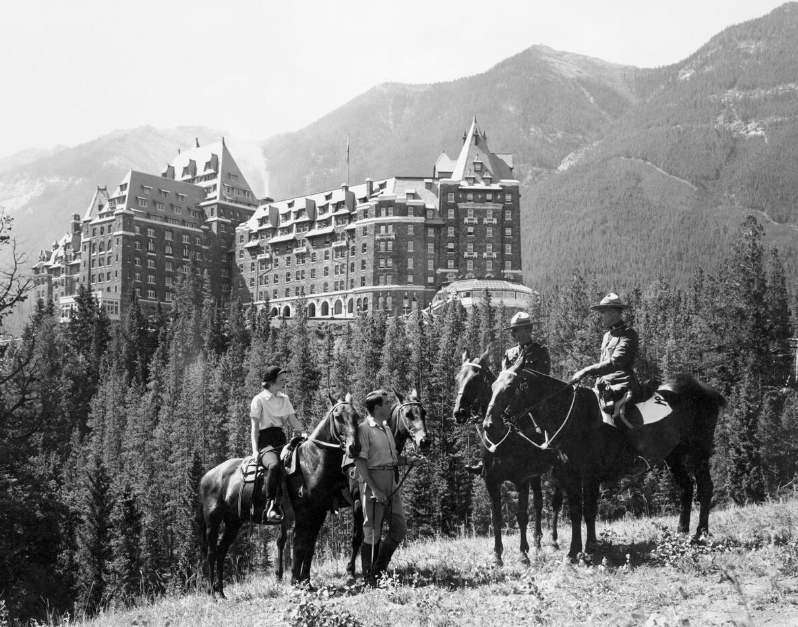 Two horseback riders stop to speak with two RCMP officers on patrol in Banff National Park in 1950. In the background is Banff Springs Hotel and the Rocky Mountains.
