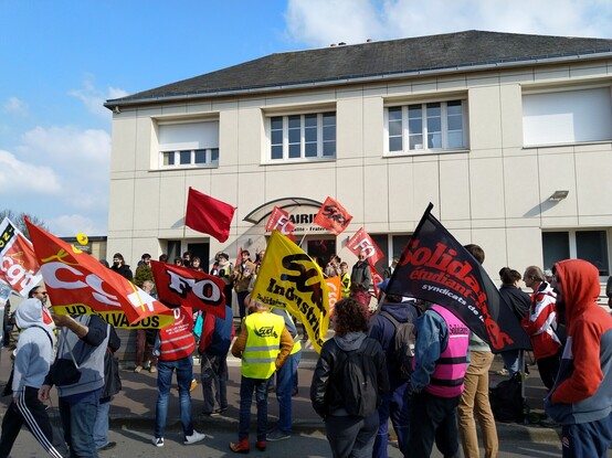 Cet après-midi, l'#intersyndicale du Calvados avait prévu une action mystère : finalement, c'était une casserole devant la mairie de Maltot, près de Caen, où le député F. Sertin, suppléant d'E. Borne, devait tenir sa permanence... annulée.