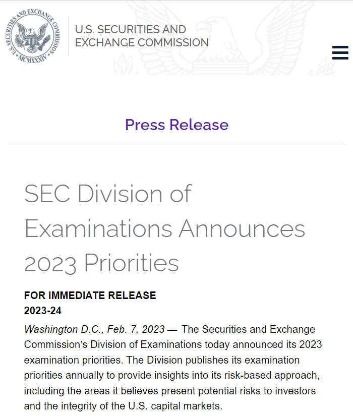 U.S. Securities and Exchange Commission's Division of Examinations, SEC Division of Examinations Announces 2023 Priorities, February 7, 2023