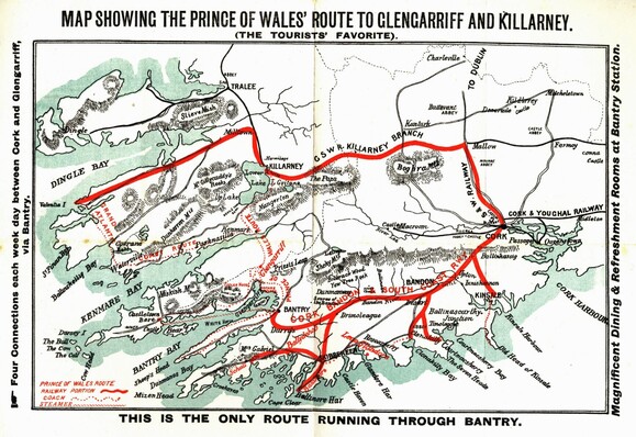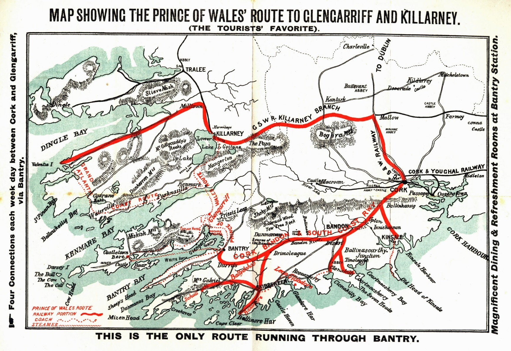 Long before the Wild Atlantic Way, we had the Prince of Wales Route to Glengarriff and Killarney, so named after an 1858 tour of the region by the Prince. This route was heavily promoted, especially by railway companies. This map of the route is from a 1903 brochure of the Cork, Bandon & South Coast Railway Company. Sadly today much of the rail tracks in this map are long gone.