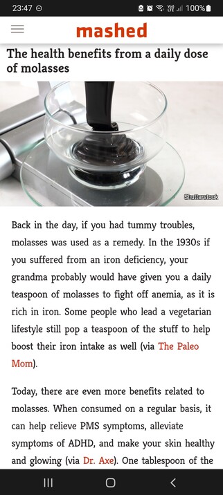 Molasses is a thick syrup like treacle and tastes like licorice. Take a teaspoon a day either on bread and butter OR in a v small glass of tepid water and glug it down (like a shot).