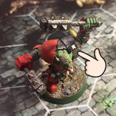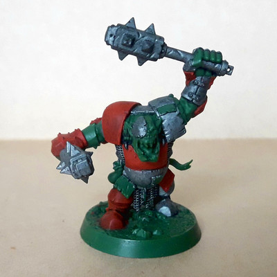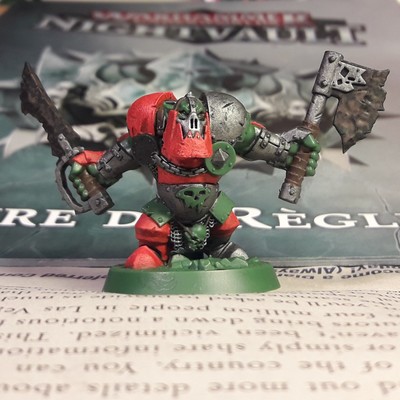 #MiniaturePainting I thought I was done with him but that part on its shoulder pad... it's not working. Not enough contrast. Red it will be then. #IronskullBoyz > Basha WIP.