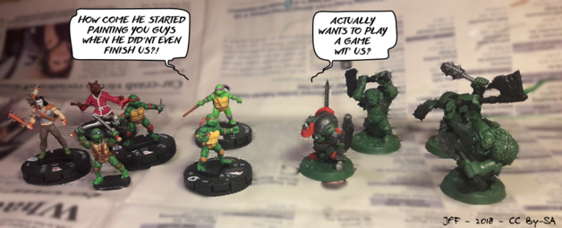 #MiniaturePainting Unfinished projects... I painted #TMNT Leonardo in June (no base though), then Raphael (almost done) then... nothing. #Orruks #IronskullBoyz #Orktober