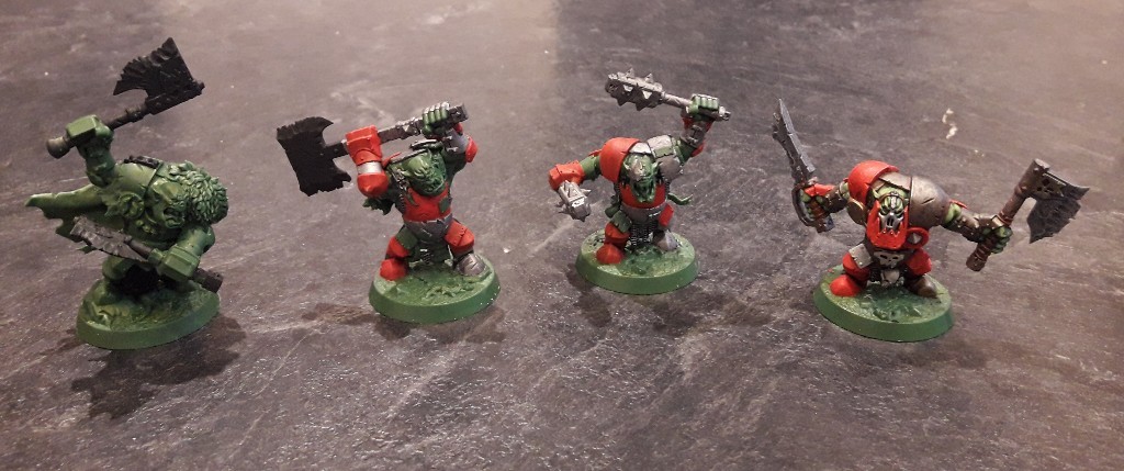 Yep, it works I think. #MiniaturePainting Those 2 #Shadespire #IronskullBoyz in the middle only got mate varnish as basecoat, some layers of red and metallic paint over black. I would not be ashamed to play them as they are, while having the possibility to improve them.