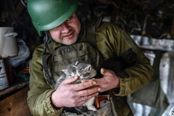 🥺 #Ukrainian soldier, call sign #Irpin, holds three of the six kittens born at the bunker of the 24th Mechanized Brigades near the town named Niu-York in the East of #Ukraine on March 21, 2023.