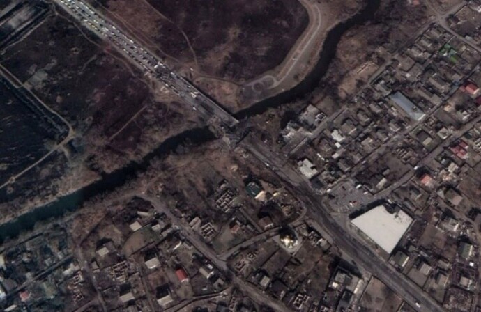 The map shows the destroyed bridge that crossed the #Irpin River in the Kyiv region. Ukrainian forces blew it up to stop the passage of Russian troops in the direction of Kyiv on 25 February 2022.👇