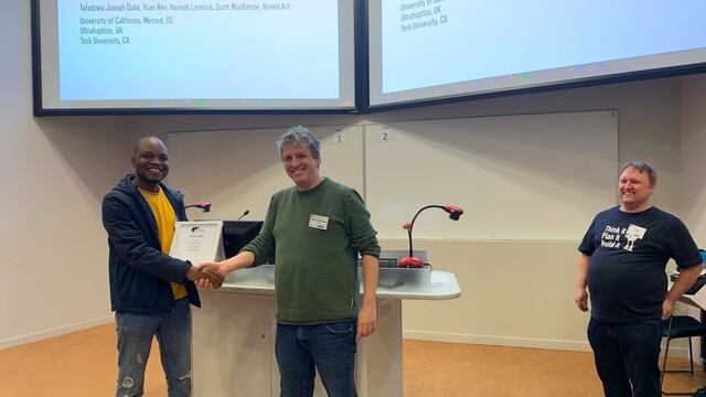 Ph.D. student Tafadzwa J. Dube accepting the Best Paper Award on behalf of the Inclusive Interaction Lab for "Push, Tap, Dwell, and Pinch: Evaluation of Four Mid-Air Selection Methods Augmented with Ultrasonic Haptic Feedback" at ACM #ISS2022 in Wellington, New Zealand. https://youtu.be/qUSAAMvqxF8