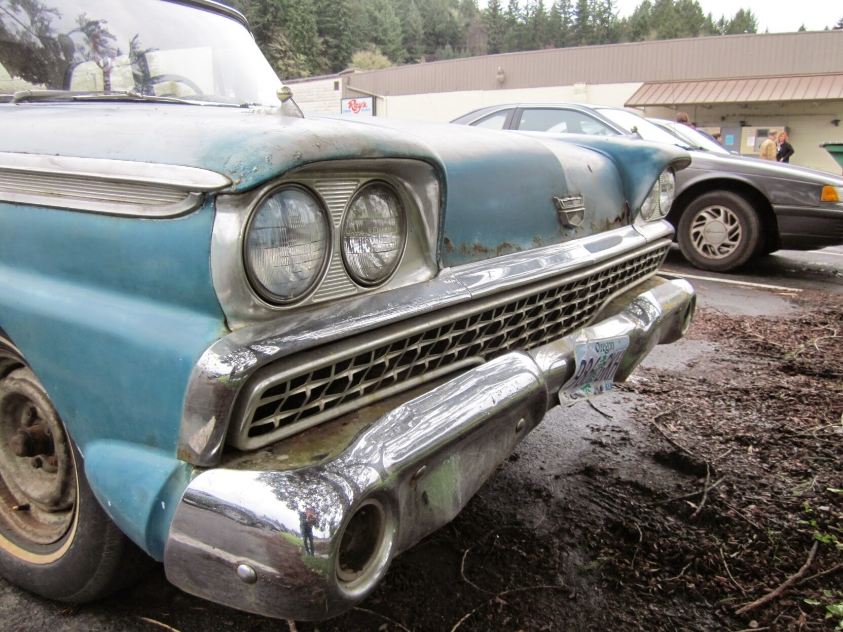 An old blue and white Ford sedan. There are several areas where the metal is rusted through, but it was still on the road.
