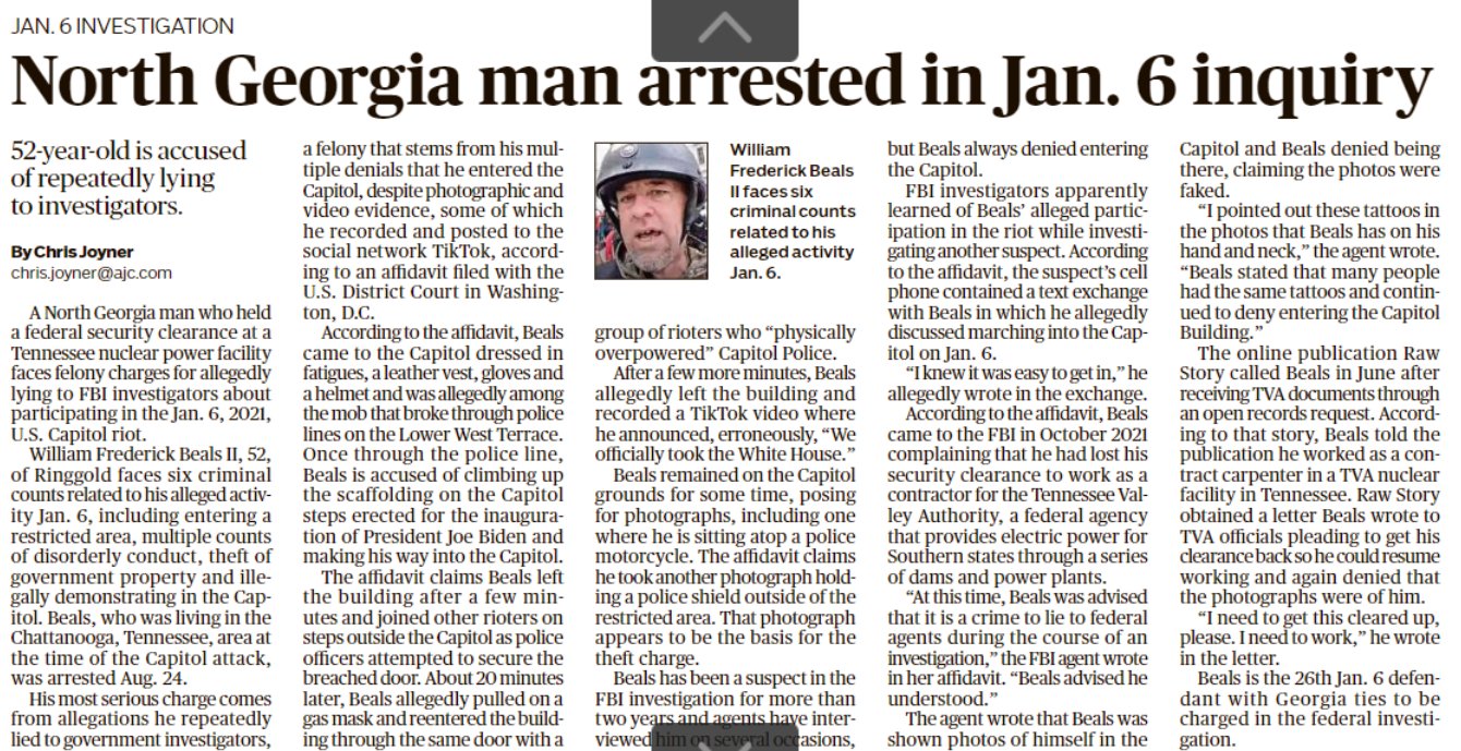 #Jan6consequences A North Georgia man who held a federal security clearance at a Tennessee nuclear power facility faces felony charges for allegedly lying to FBI investigators about participating in the Jan. 6, 2021, U.S. Capitol riot.