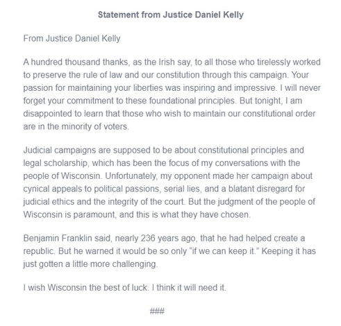 "My opponent made her campaign about cynical appeals to political passions, serial lies, and a blatant disregard for judicial ethics...I wish Wisconsin the best of luck. I think it will need it."