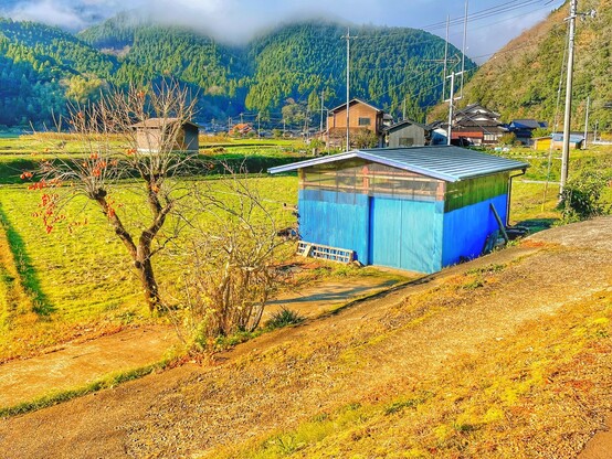 Description: small blue work shed sitting in a green field with a persimmon tree in front of it