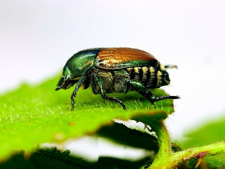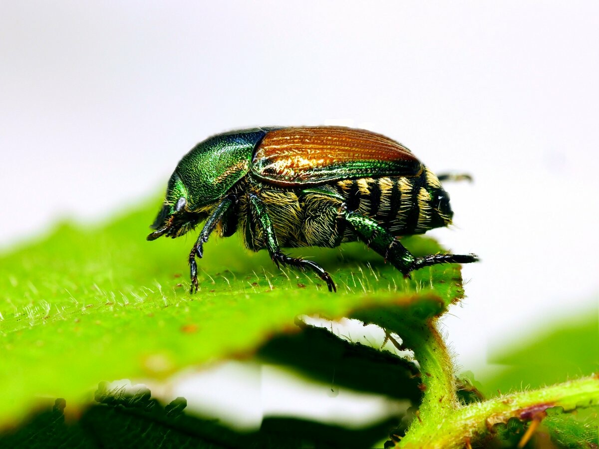 Der #Japankäfer ist nur etwa einen Zentimeter groß, hat kupferglänzende, braune Flügeldecken und einen metallisch grün glänzenden Kopf. Als besonderes Merkmal besitzt er an jeder Seite fünf weiße Haarbüschel und zwei weitere am Hinterleib. (3)