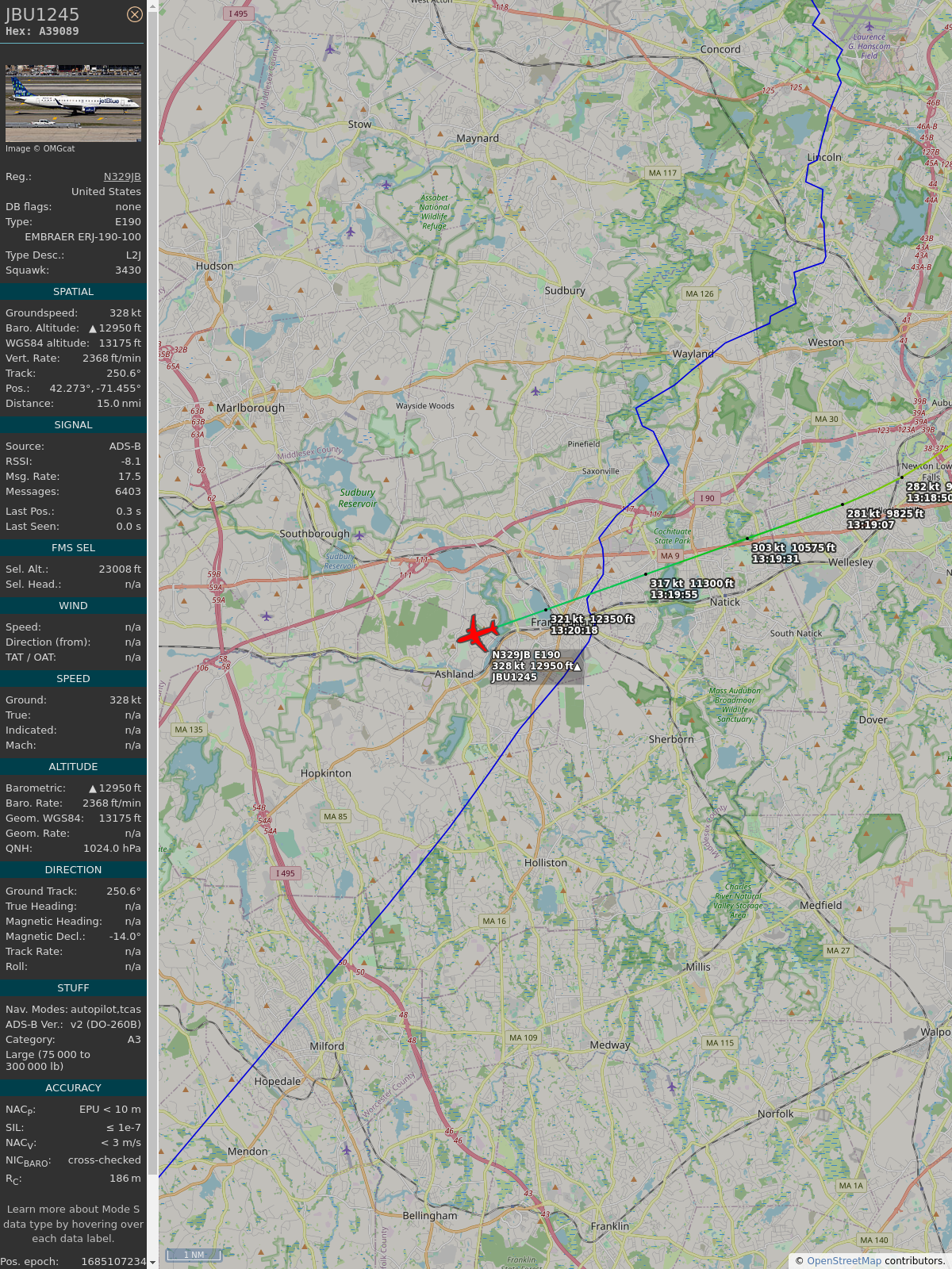 #a1ff83 #jbu1245 #jetblue #bos #clt #planefence #adsb