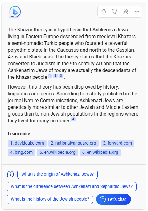 Bing is at it again. This time, a search of the Khazar theory returns results from whïte supremacïsts as the two leading results. When will Microsoft stop their search engine from helping to spread bigotry? #mazeldon #jewdon #Jewniverse
