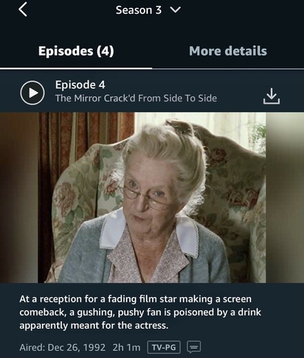 My current #StandardDisclaimer still applies to this week's #TVMysteries episode of #JoanHickson's definitive #MissMarple, but considering the bullshit and stupidity the #CurseOfMelonHead is regularly inflicting on the birdsite :birdsite: I foresee a day when it will JUST. STOP. WORKING.