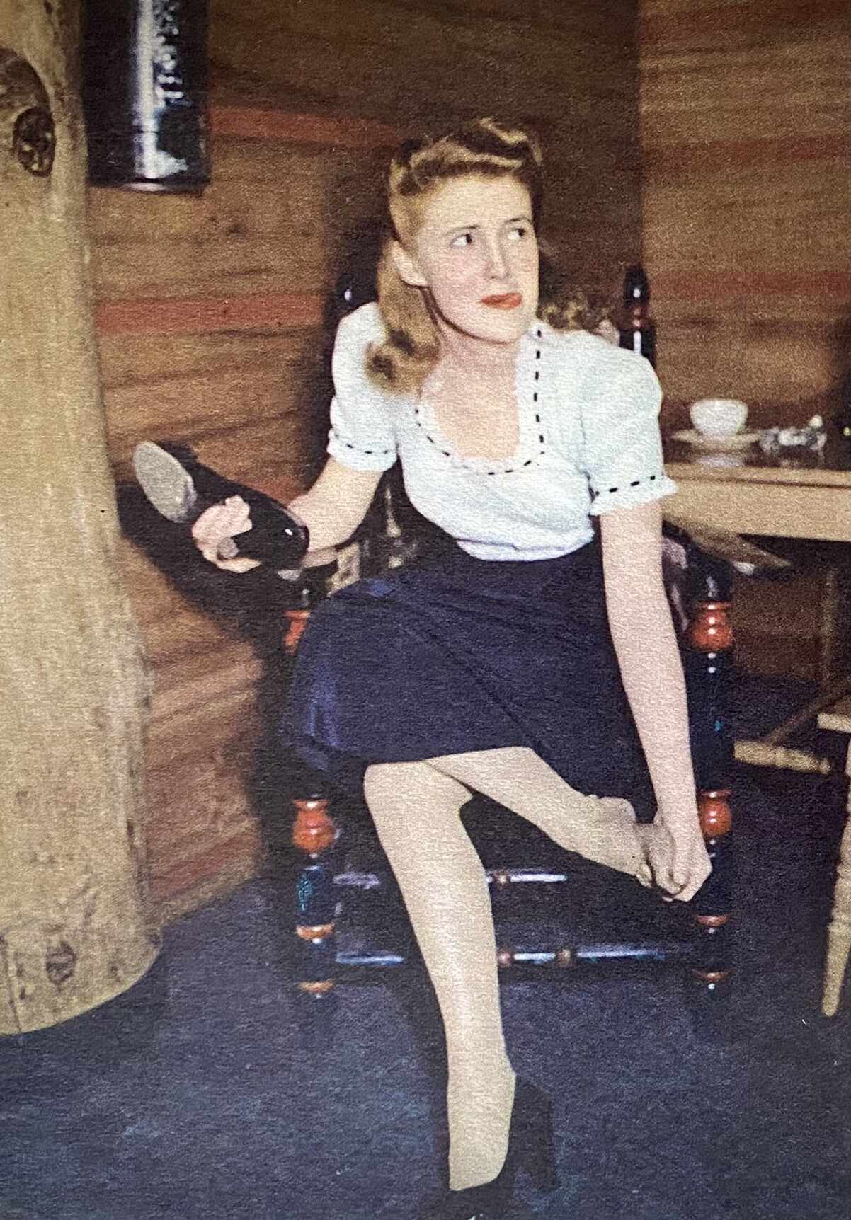“Junior hostess, Joan Leslie, sits this one out. Gives tootsies a needed rest.”