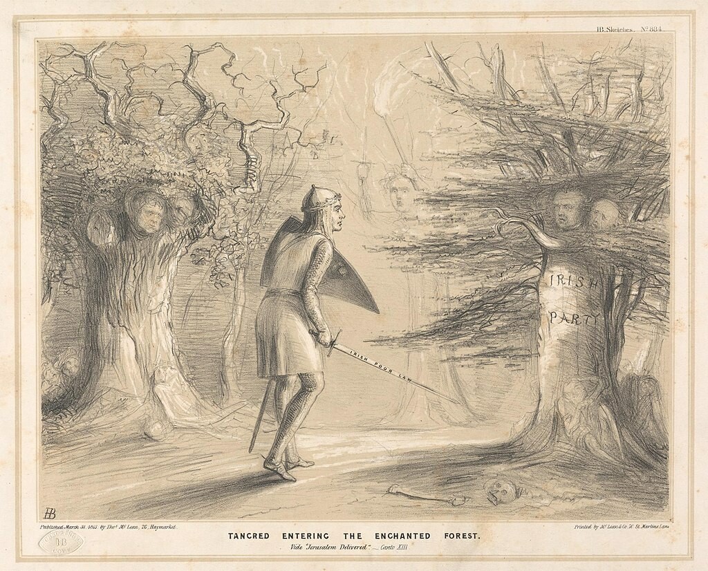 [Note that this is actually an image of a man called Tancred entering an enchanted forest, re-imagined by Irish artist John Doyle (1847) in the context of the Irish Poor Law.]