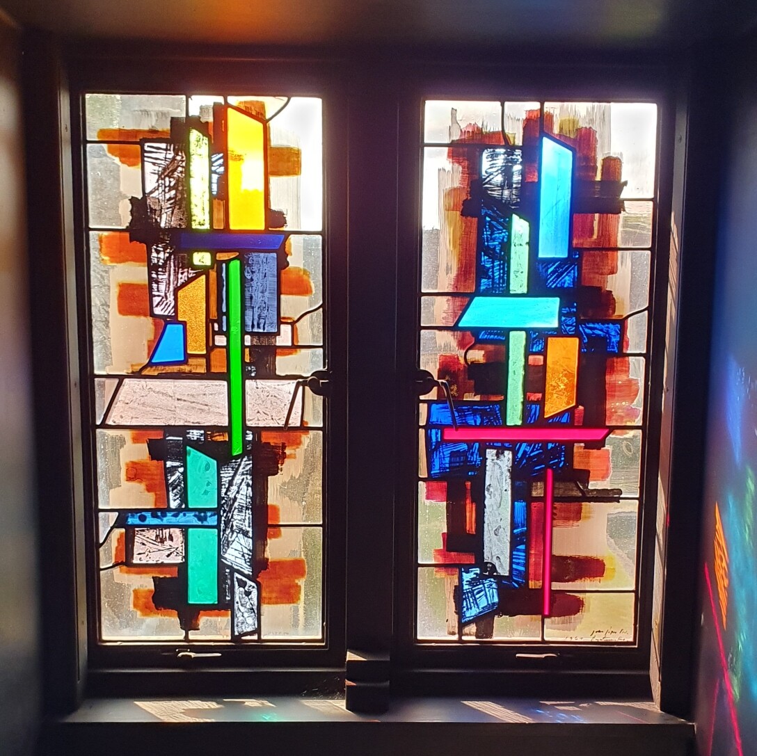Stained glass windows in the chapel at work, made by John Piper. #StainedGlass #JohnPiper