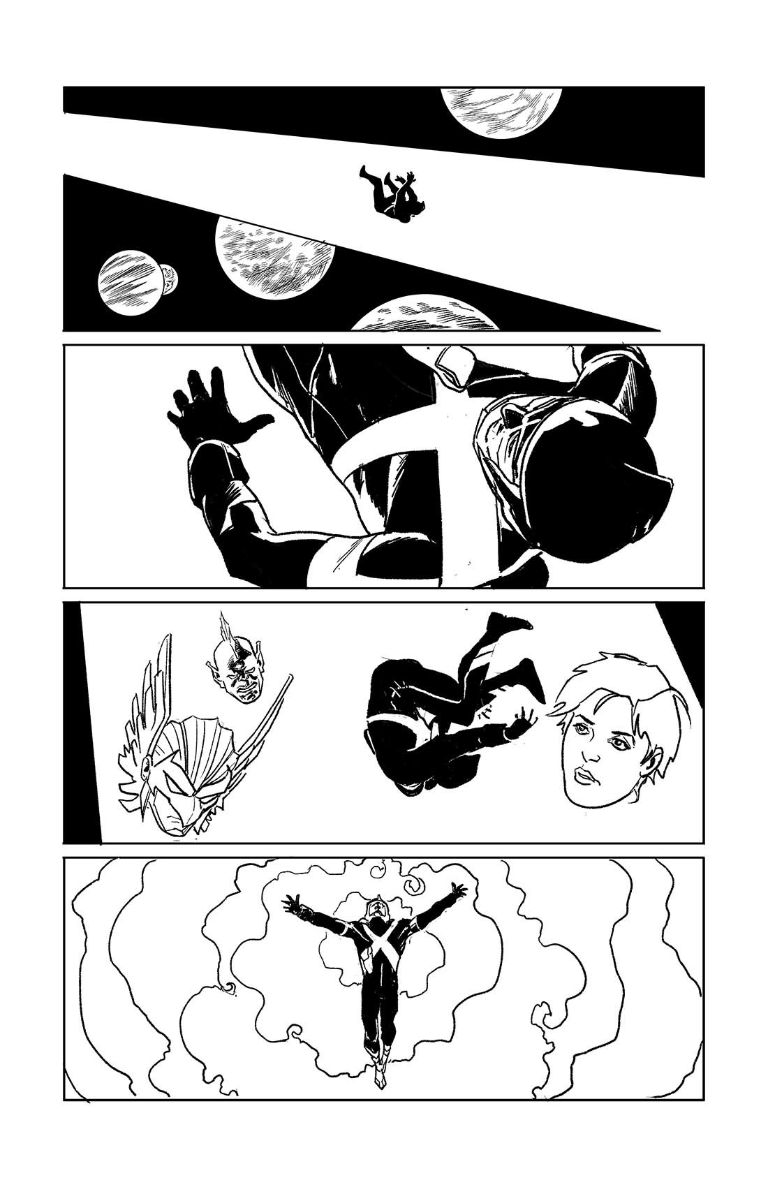 Black and White line art from an issue of Future Quest I drew for DC Comics. )It also starred Adam Strange, an old DC favorite.) This was written by @JeffParker, who made sure I had fun imagery to draw on every page.