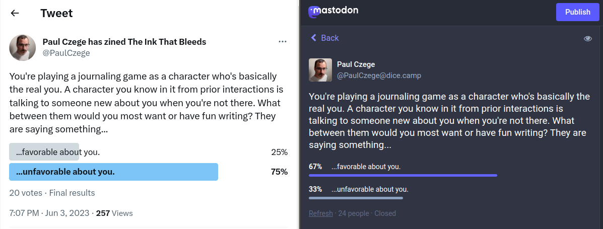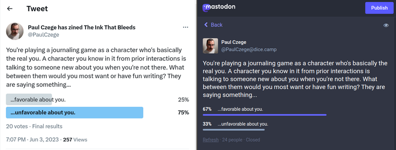 We all find ways to talk about stuff that's important to us. People tell me all sorts of crap when I'm waiting for the bus, or at the store. "My mother got the Covid shot and it killed her." I'm encouraging of people talking about play of journaling games in The Ink That Bleeds. I think narratives running in us are important to who we are. I think we make the world what it is with those narratives, and I think people who feel I'm right will find ways to talk about their play.