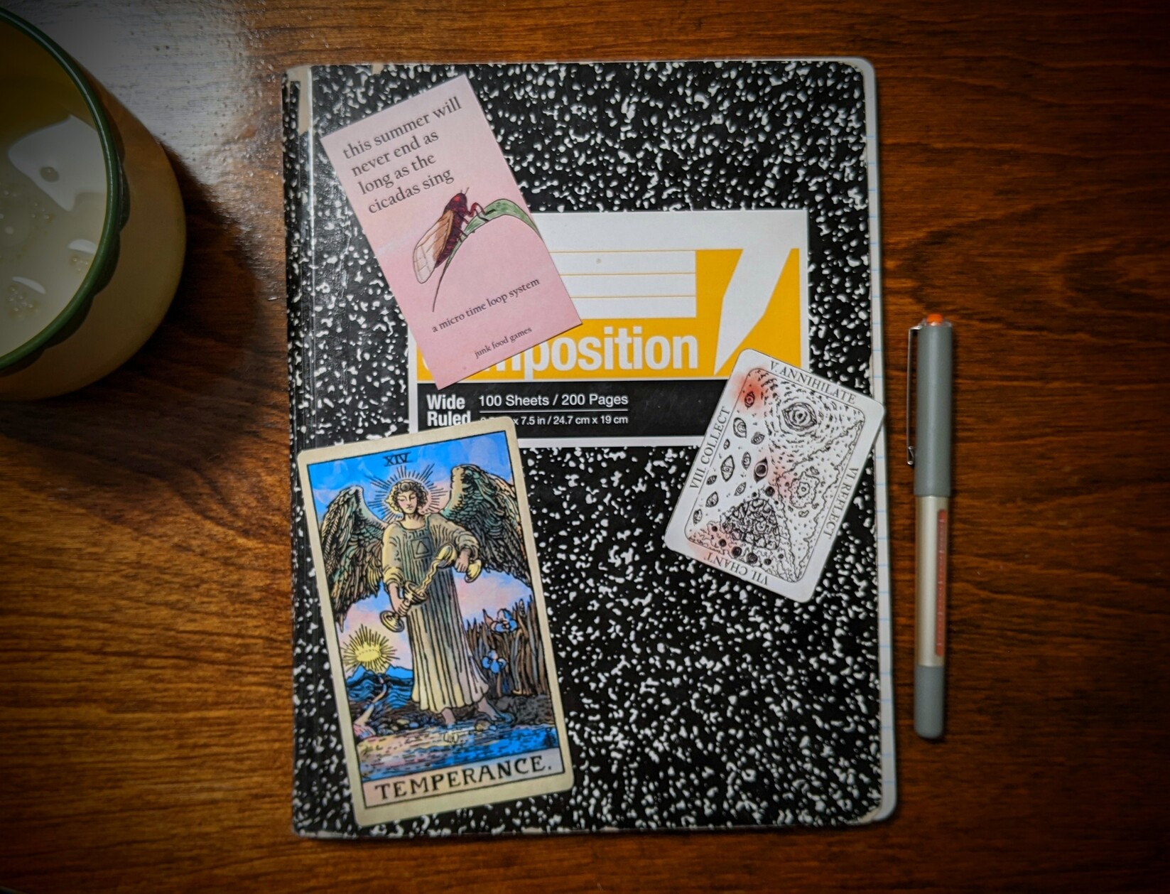 I've designed a few things to use as fun moves or self care or house rules within the play of a journaling game and I've been looking for similar things by other designers. So I just got Dana's Relic and 'this summer will never end as long as the cicadas sing' by @junkfood_games.