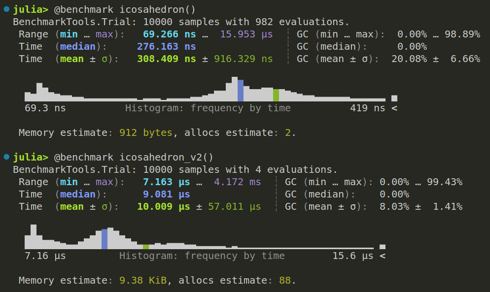 Slowly learning more #JuliaLanguage. Really loving the benchmarking tools. So easy to use. This image shows the comparison of two versions of a function. The benchmarking information is conveniently summarised like this in the REPL.