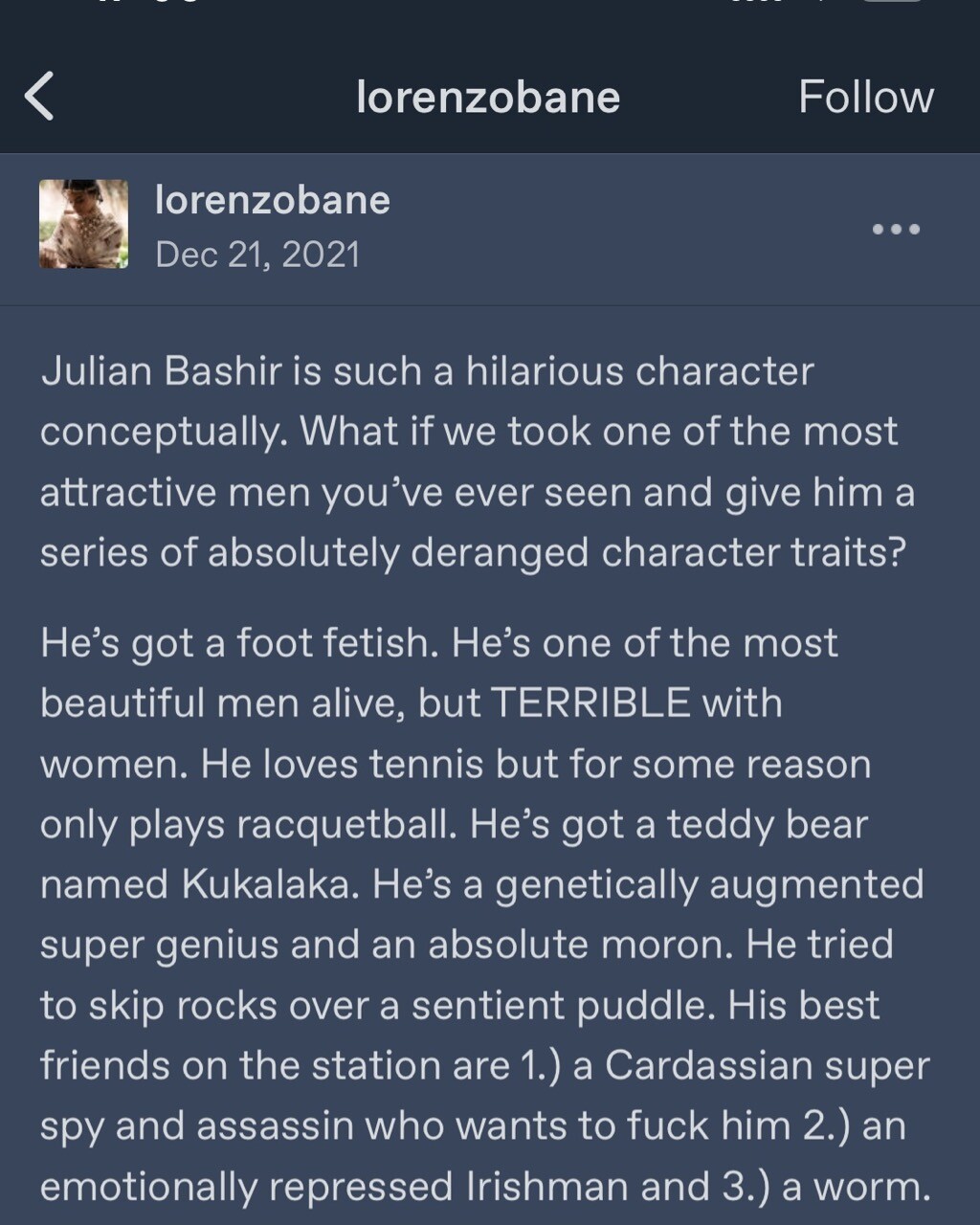 i've been rewatching #DS9 and even though i despise the site i have to admit tumblr has the most devastatingly accurate shitposts about our most beloved characters #JulianBashir #StarTrekDS9 #AWorm