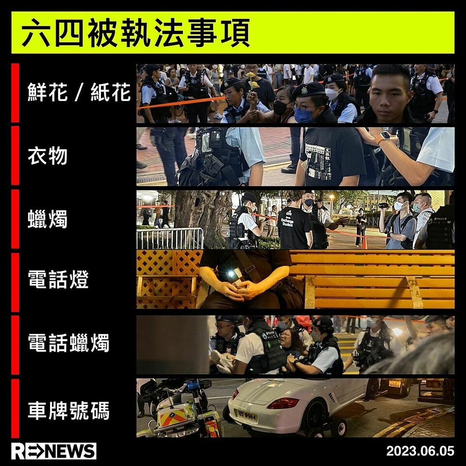 R to @hkdc_us: This ReNews graphic gives a good overview of the things 23 people were taken away for in Causeway Bay #HongKong on #June4: flowers, clothes, candles, phone lights. A car was also impounded for having a "8964" license plate (police said there were 2 other infractions). https://nitter.hongkongers.net/hkdc_us/status/1665747017195302912#m
