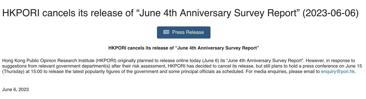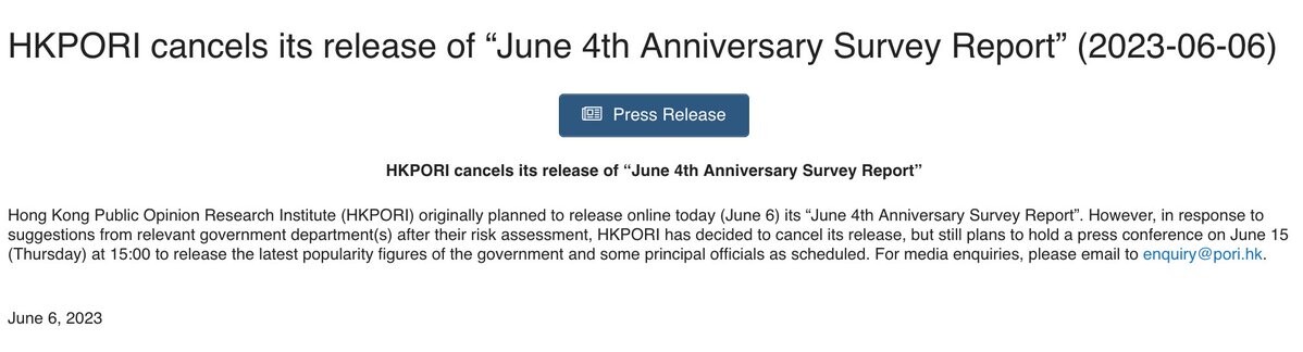More #Censorship in #HongKong: Polling org @hkporihkpop cancels #June4 Anniversary Survey report "in response to suggestions from relevant gov't depts..." The survey asked, "Did the Chinese gov't handle the June 4 incident correctly?" & similar questions. https://www.pori.hk/press-release-en/2023-06-06-pm.html?lang=en https://nitter.hongkongers.net/hkdc_us/status/1666058423123820544#m