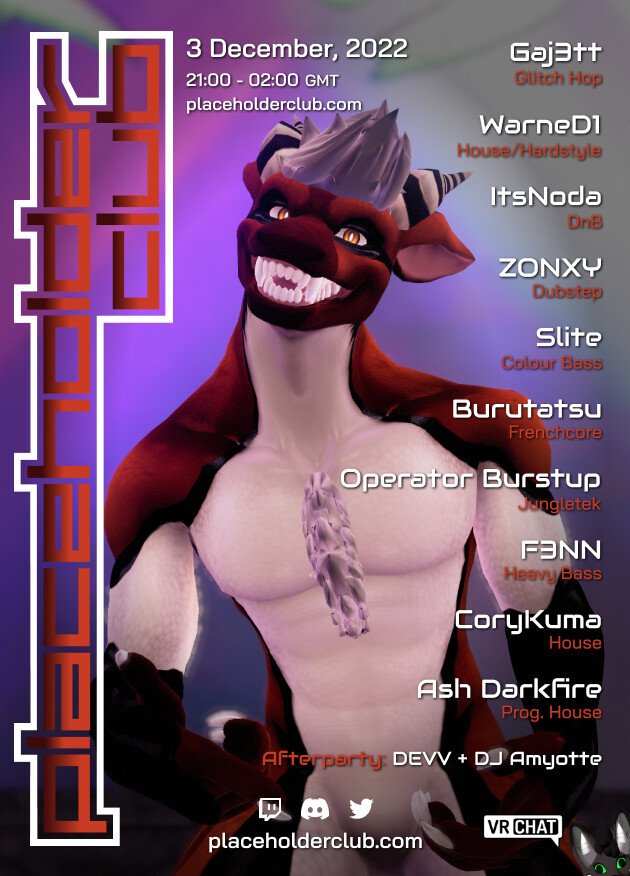 If you liked my #jungletek set at FurRaveNous two weeks ago: I'll do another one tonight! At Placeholder Club - one of the best regular events in #VRChat thanks to its amazing crowd & team. Once again, there will be ten (!) DJs playing various music genres! Join us in #VR! #DJ #furry #techno #house #raggatek #hardtek https://placeholderclub.com
