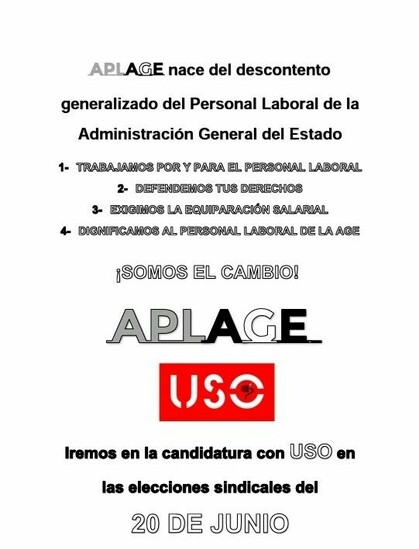 La Asociación de Personal Laboral de la Administración General del Estado, (APLAGE), ha decidido presentarse a las elecciones sindicales bajo las siglas de USO.