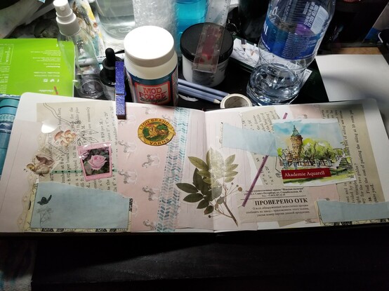 I've never done a #JunkJournal before, and this is experimental, but as I'm going through my stuff for the move, I'm finding things that are interesting and seem to fit, so I'm throwing it onto this page. Still a #wip, layering more stuff on as I find it. When it's all stuck down and the glue dries, I'll put watercolor ground on and paint on it. Or I dunno, blend the lines some. Covered in glue. :artsits: