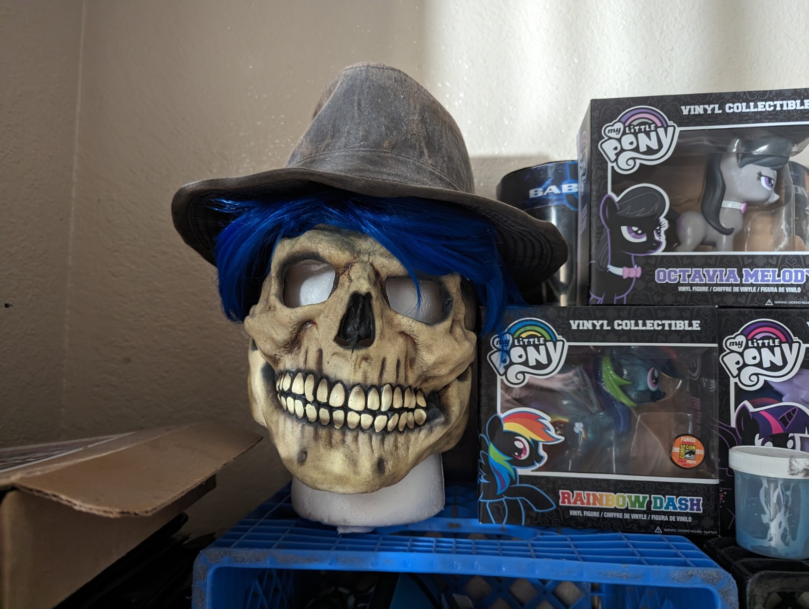 No, I'm not a complete and total basket case. I simply have a mannequin head with a Halloween mask, a wig, and a fedora.