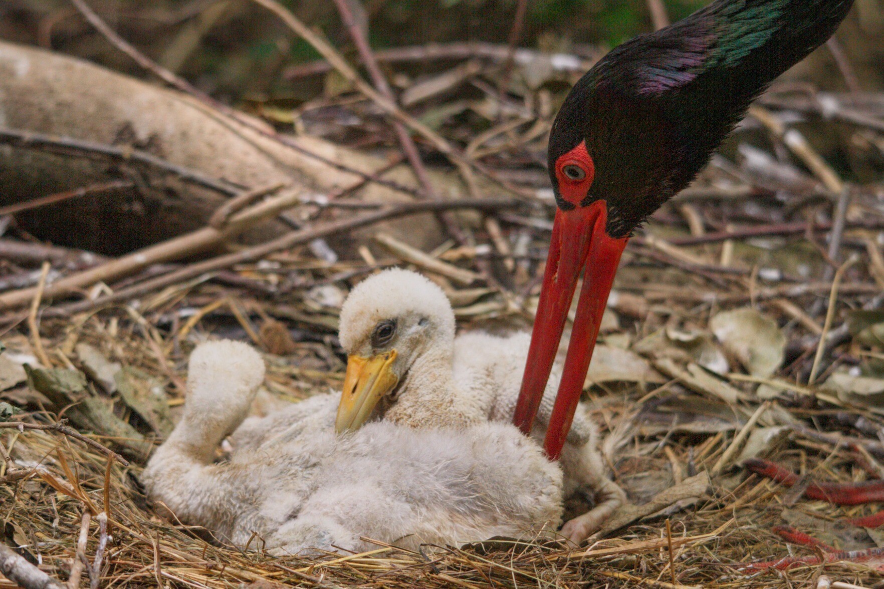 Mama #Schwarzstorch mit ihren #Küken. Interessant die Grössenunterschiede... (Hw.: Das Bild wurde natürlich mit einem Teleobjektiv gemacht, um nicht bei der Brutpflege zu stören)