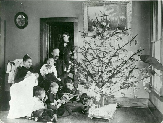 The Stoltz family in their home at 4th and Hickory (where the US Post Office now stands) in Ottawa, Kansas at Christmas. Pictured Elizabeth Stoltz holding baby Herman, Fred Stoltz holding Fred Jr., children William, Elizabeth, and Mary on the floor, and Andrew Volk stands in the doorway. 1897. 5/
