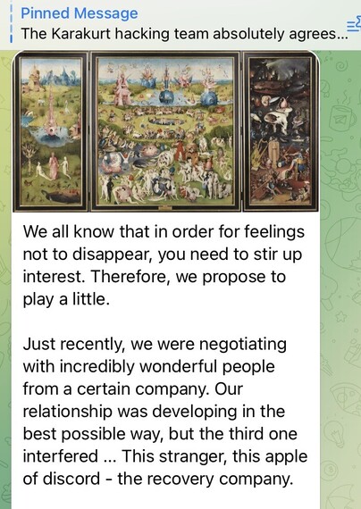 #Karakurt waxes poetic about their encounter with an “apple of discord.” Tip: if you need to deal with extortionists, call in an “apple of discord.” And call in LE too. They can help, which is precisely why cybercriminals try to convince victims to go it alone.