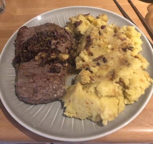 Kartoffelpüree mit gedünstetem Spitzkohl und Rotweinjus