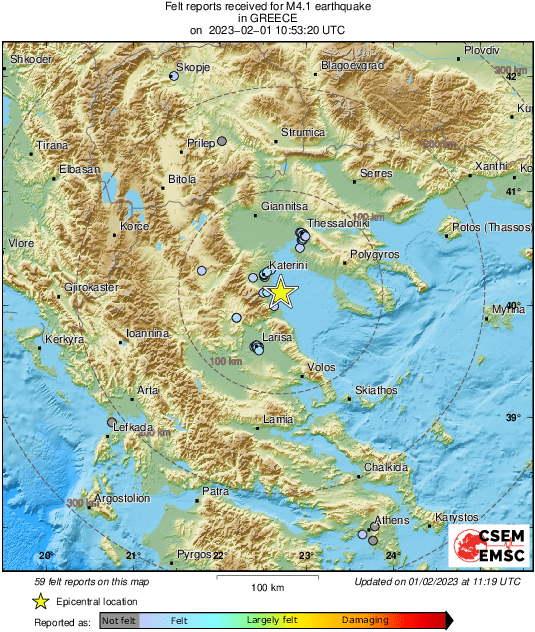 #Earthquake 25 km SE of #Kateríni (#Greece) 26 min ago (local time 12:53:20). Updated map - Colored dots represent local shaking & damage level reported by eyewitnesses. Share your experience via: