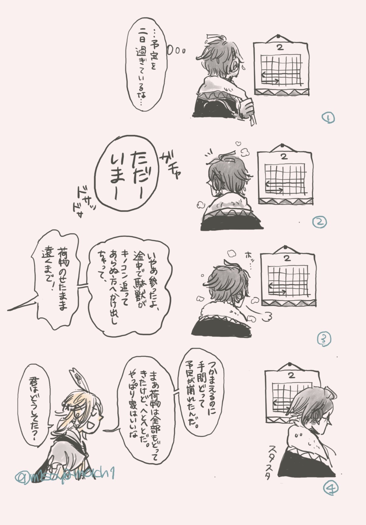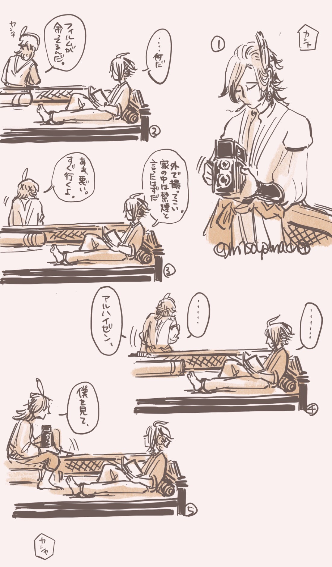 A drawing of the "roommates" of Sumeru~ This to get used to their designs but also to practice expressions with Kaveh because he's so cute <3