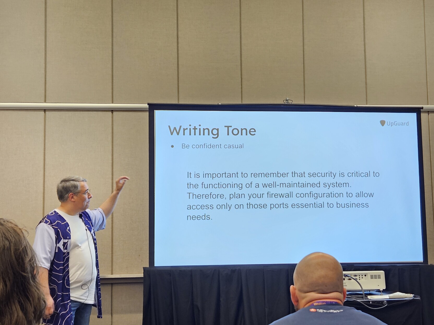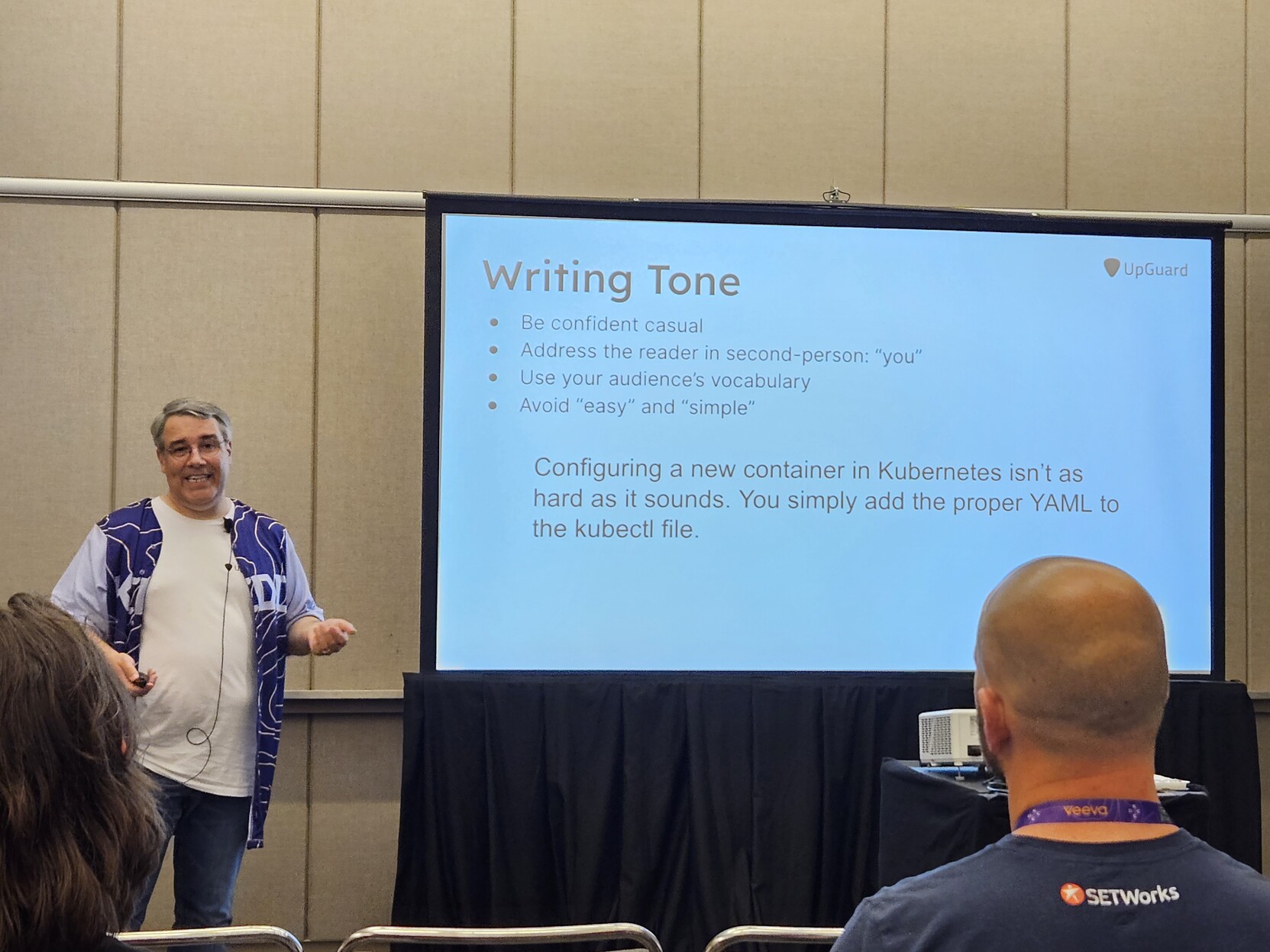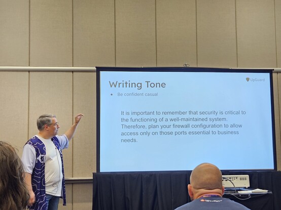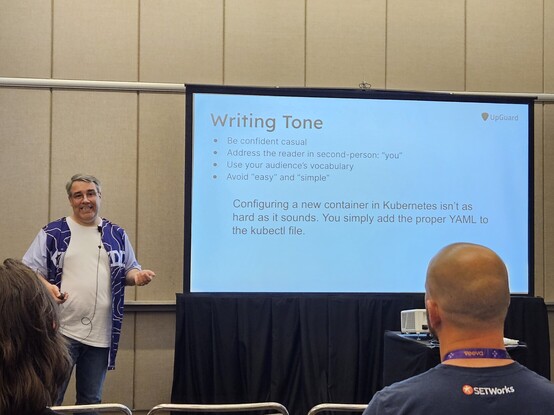 Use "confident casual" as your documentation tone. 1:1, as if you were talking to a smart junior colleague who's smart, motivated, and just needs to know how to do the thing. You don't need to pretend you're in a lecture hall and attempt to use words to burnish your authority. You already have the authority; you wrote the docs. And no "we"; you as the author aren't adding a user to the database or configuring the server. - @bmac #kcdc