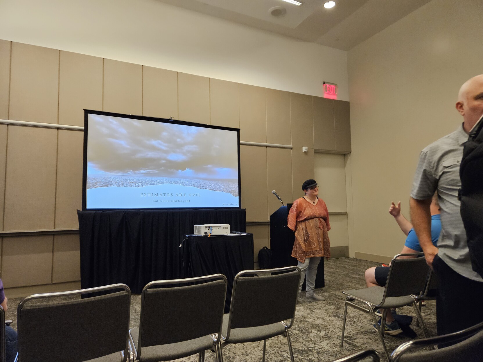After running around the sponsor area, I'm back to attending sessions at #kcdc. Next up: Jennie Ocken talking about how estimates are evil but can be used for good.