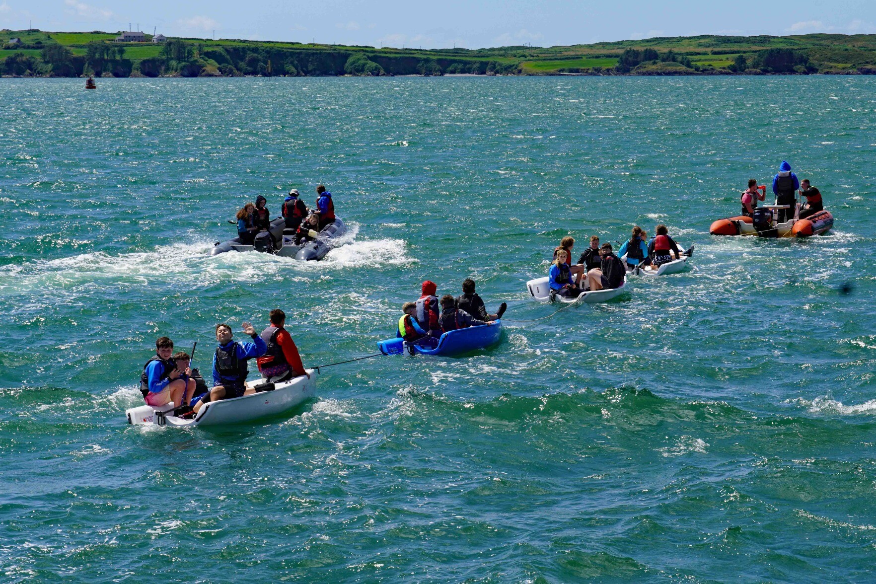 Four boats, full of energetic kids, all in a line as they head out of the small Baltimore harbour. All four are linked by rope and are towed upfront by adults, with more supervision to the left. #baltimoresailing #baltimoresailingclub #wildatlanticway #training #baltimorewestcork #westcork #keepdiscovering