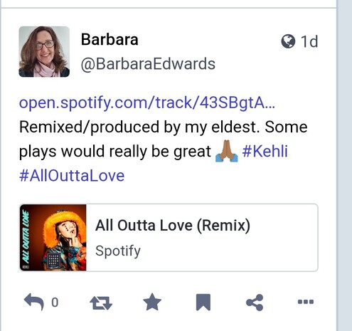 https://open.spotify.com/track/43SBgtABKf7vvs5QB3Y9zf?si=075mE8UpRuKGCp0J-6XDEw Remixed/produced by my eldest. Some plays would really be great 🙏🏾 #Kehli #AllOuttaLove