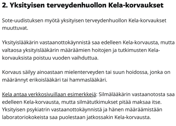 Ja tässä toinen muutos, joka vaikeuttaa hoitoon pääsyä. Esim. pk-seudulla gyne+silmä+lastenlääkäri+hammas pyörii pääosin julkisen kautta, koska julkiselle ei pääse. Muutos tipauttaa paljon väkeä pois ja kasaa kuluja yhteiskunnalle jälkijättöisesti, kun hoitoon ei pääse.