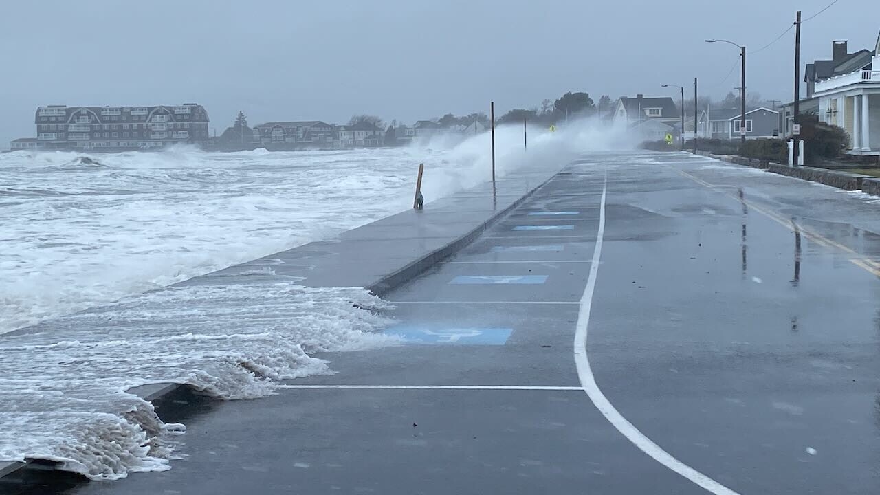 Coast flooding in #kennebunk beach #maine - ocean overtopping sea wall at high tide, area streets closed / impassible. #weather #MEwx