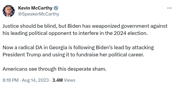 > Kevin McCarthy says ‘Biden has weaponized government against his leading political opponent’ to interfere in 2024 election