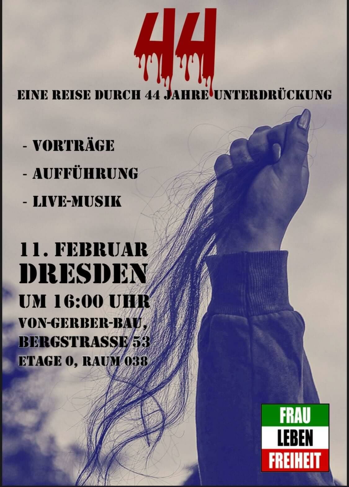 Für Samstag, d. 11.Februar 16:00 laden die Iranische Community und #FrauenLebenFreiheit_Dresden anlässlich des 44. Jahrestags der "Islamischen Revolution" um #Khomeini in den GerberBau der @tudresden_de ein, um zu reden und Solidarität zu zeigen. Ihr seid herzlich eingeladen #jinjianazadi #IranRevolution