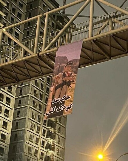 Installazione di uno striscione con la foto di #Kian_Pirflak su cui è scritto "Governo che uccide bambini" sull'autostrada Absansan.