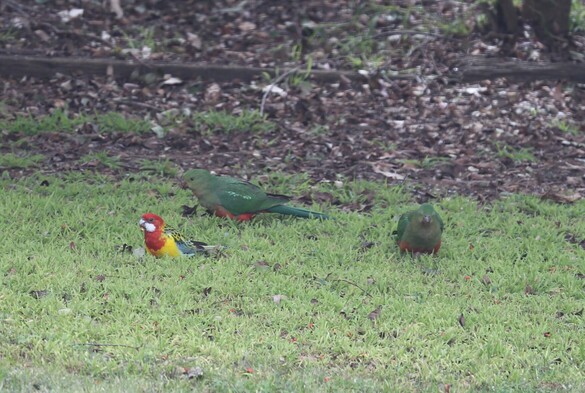 Parrots in the backyard - an Eastern Rosella and a couple of King Parrots. Taken in Armidale NSW Australia. #birdsOfMastodon #birds #naturephotography #Armidale #NSW #Australia #EasternRosella #KingParrots
