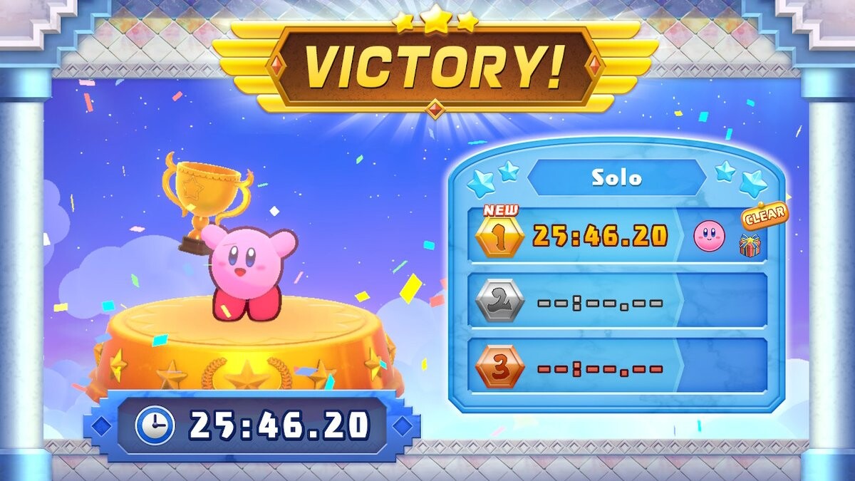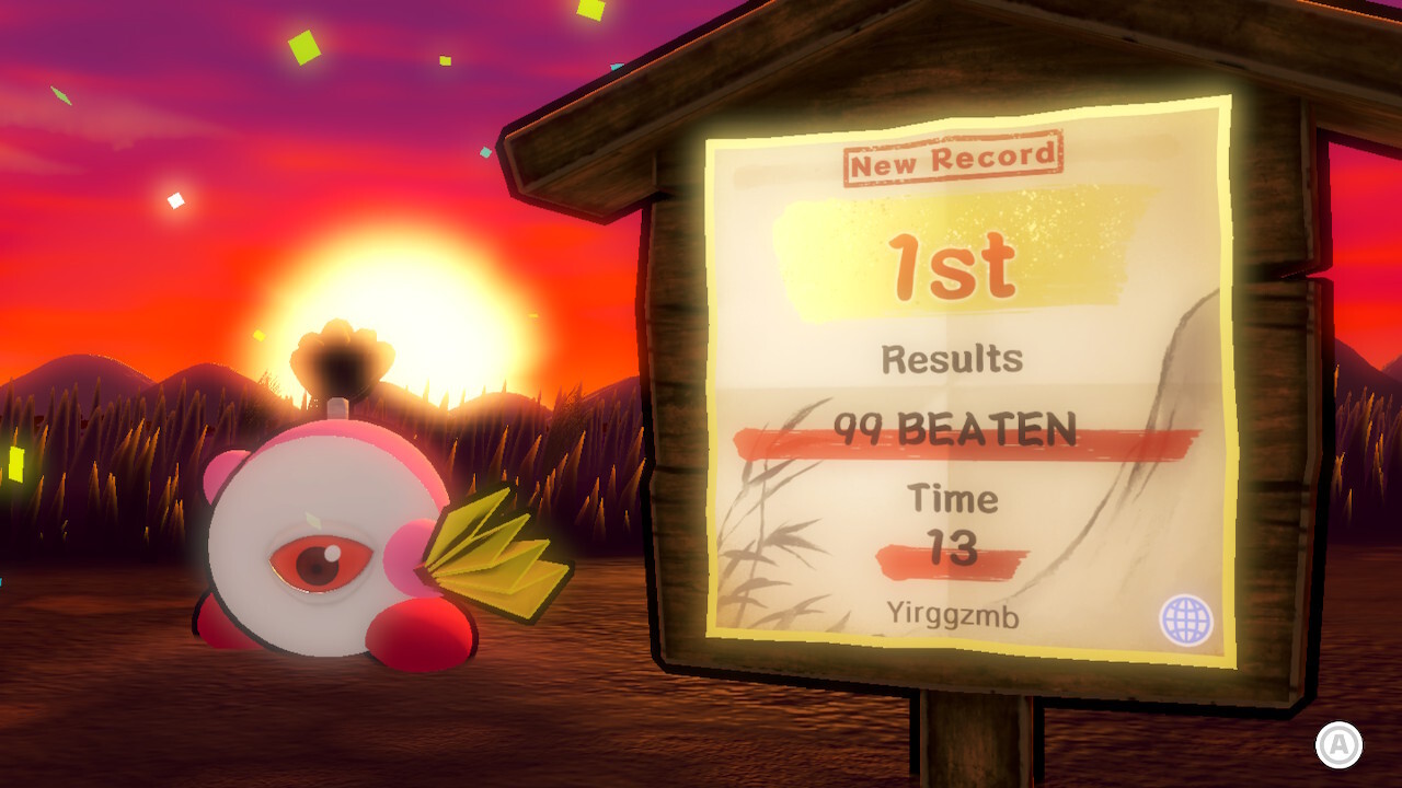 Oh yeah I did this too! It's a once per day thing where you go against the times of the previous 99 people to play. I came in first! Any of the next 99 people to play will have to beat my time of 13 frames to win. #kirby #kirbysReturnToDreamLandDeluxe